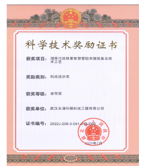 湖庫污染修復(fù)智慧管控關(guān)鍵裝備及技術(shù)工藝喜獲2022年湖北省科技進步獎